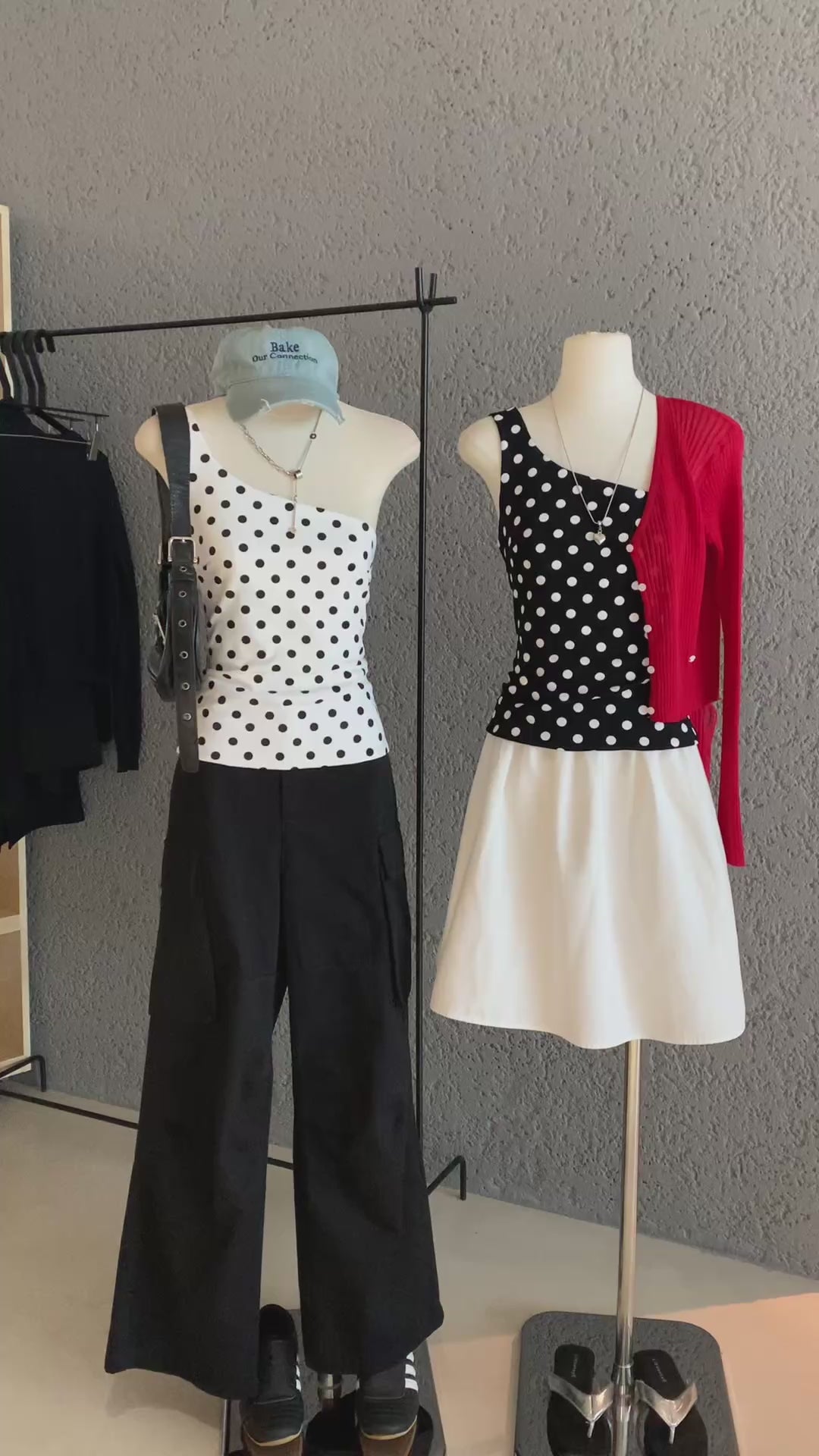 单肩露肩上衣无袖性感纯欲辣妹波点挂脖吊带背心
