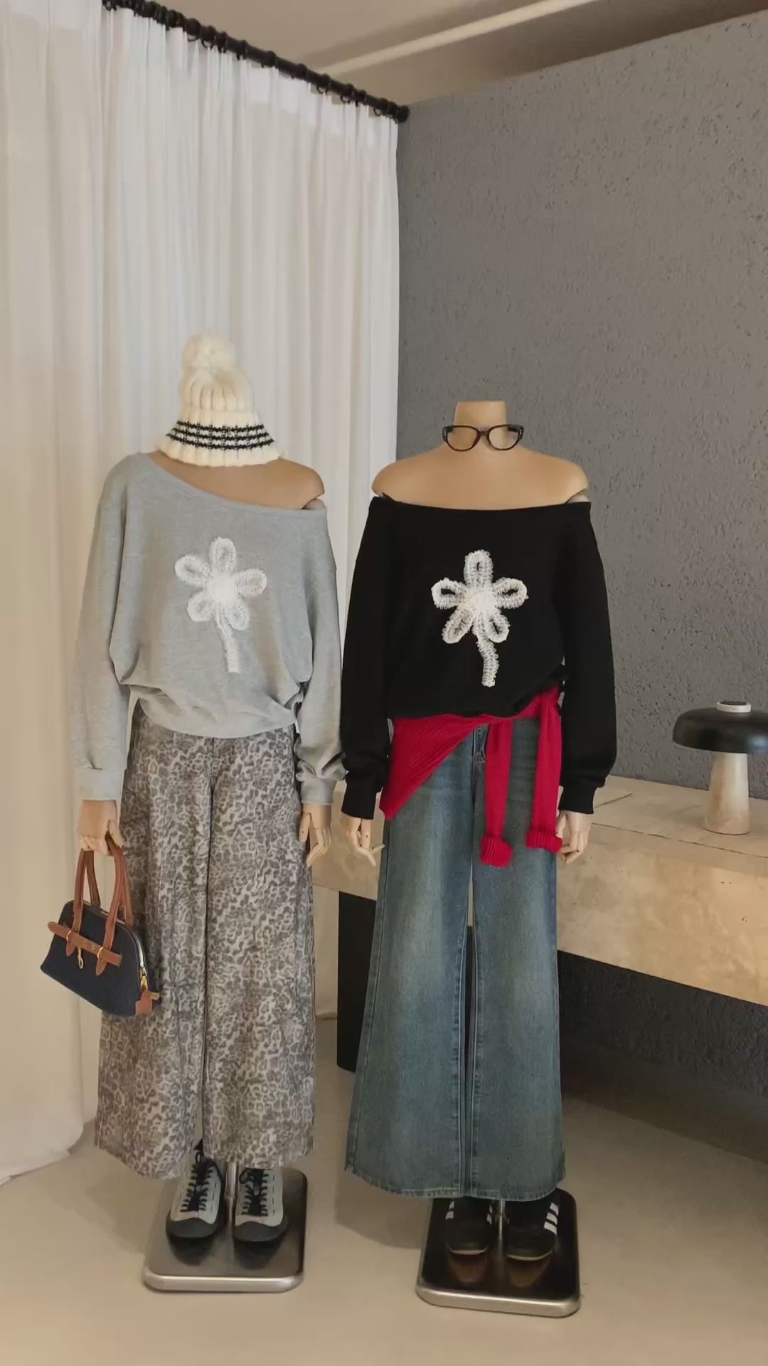 韩版设计感斜肩单肩露肩立体花朵卫衣