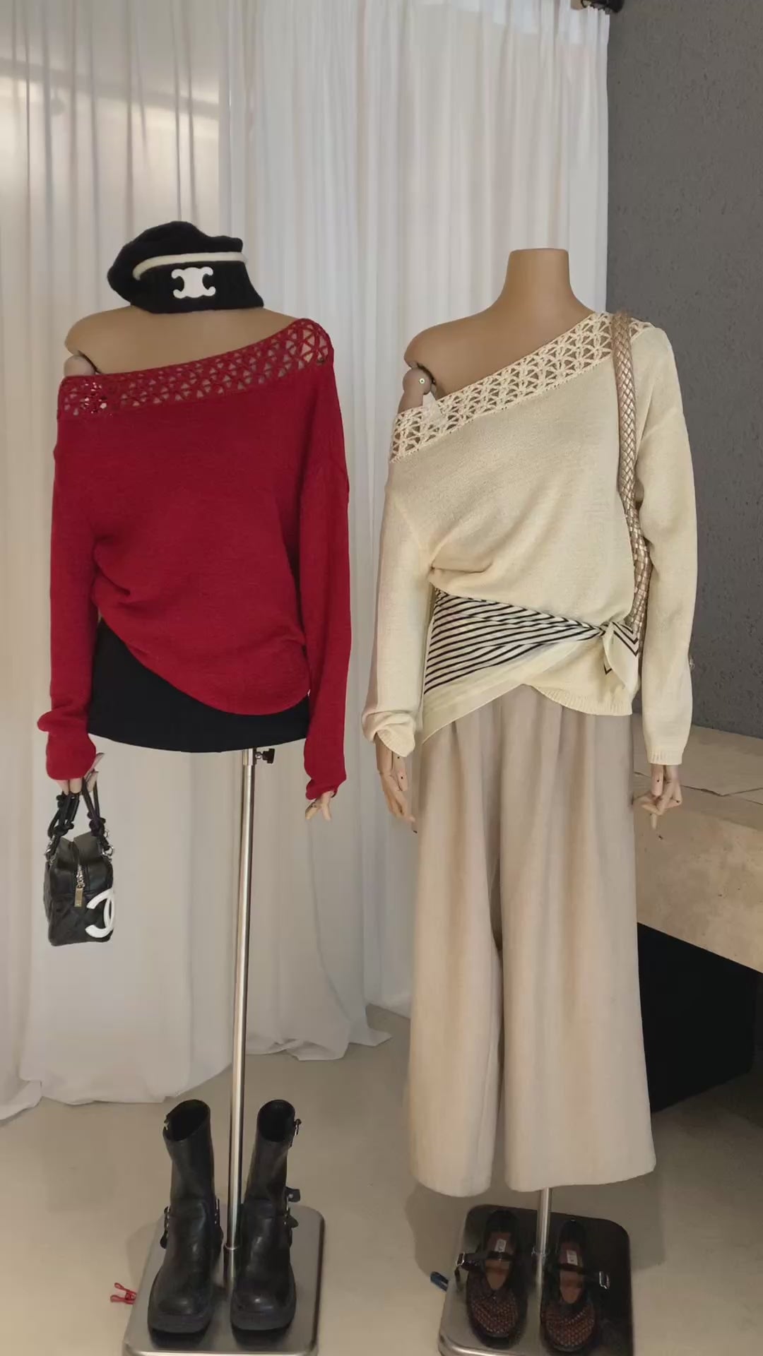 法式慵懒毛衣镂空花边斜肩领针织衫女宽松显瘦百搭上衣
